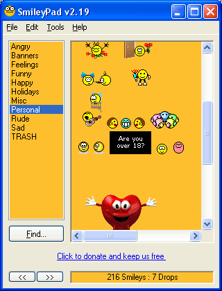 Эти смайлики вы можете использовать везде, где разрешается вызов внешних изображений: форумы, e-mail в формате HTML, некоторые мессенджеры. Физически картинки лежат на сайте сервиса Smileypad.com. Программа содержит более 200 смайликов. Правда, сразу видно, что это вовсе не собственная разработка данного сайта, а они просто надергали смайлики отовсюду, откуда смогли. Впрочем, смайлики - они же как анекдоты, в том смысле что авторские копирайты на них предъявляют крайне редко.