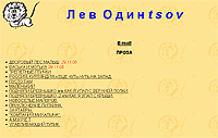 Персональная страничка Льва Одинцова. Там нет практически ничего, кроме его прозы. Но вот как раз ее вполне имеет смысл почитать. Мне достаточно случайно попалась ссылка на его роман "Россия, Курляндия и еще чуть-чуть на запад", и я его прочитал не без удовольствия, хотя сейчас практически нет времени что-либо читать. Жанр весьма своеобразный: нечто вроде псевдоисторического детектива со всякими фэнтезийными элементами. Вроде смешение всяческих стилей, но как раз это составляет основную изюминку. Да и язык вполне неплохой, так что рекомендую.