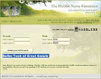 В свете выхода в свет (самая что ни на есть тавтологическая тавтология получилась, и я ею даже немножко горжусь) всяких "Властелинов колец" и других новых приключений неуловимых хоббитов, знакомлю вас с сайтом The Hobbit Name Generator.