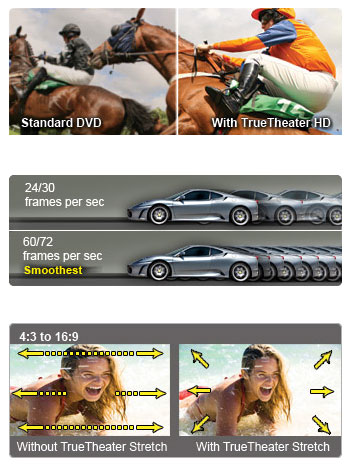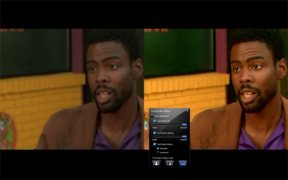 Во-вторых, добавили целый комплект фильтров постобработки под название TrueTheater: масштабирование обычных DVD в HD с улучшением яркости и контраста, сглаживание быстро движущихся изображений на хороших компьютерах, режим интеллектуальной обработки при растягивании 4:3, обработка звука.