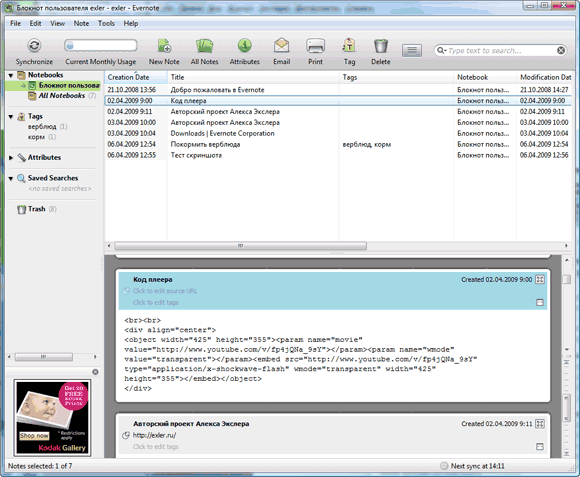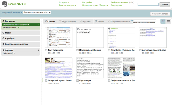 Итак, сайт Evernote.com. Изначально это был чисто англоязычный сервис, но сейчас уже есть русскоязычная версия (располагается она по тому же адресу; нужный язык, судя по всему, определяется по IP, а кроме того, сверху слева есть ссылка на соответствующий языковой интерфейс). Схема работы там следующая. Регистрируетесь, заводите свой профиль, он же личный кабинет. В личном кабинете можно создавать так называемые блокноты (например, "личные заметки", "рабочие заметки"), в которых сохраняется самая разнообразная информация следующего вида: