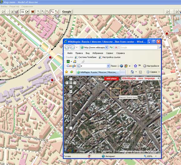 Причем карта еще и связана с WikiMapia, что позволяет всем желающим отмечать там какие-то объекты и давать им описания. Правда, эти все желающие нередко лажают, в результате чего достоверность информации вовсе не стопроцентная, но тут уж ничего не поделаешь. Зато карта из Google показана просто шикарно - это очень удобно.