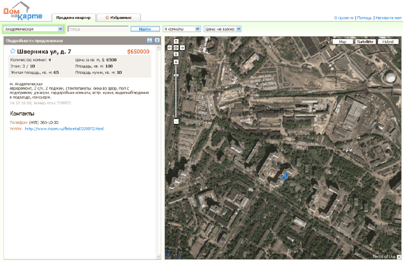 Второй пример использования Google Map API - новый проект "Дом на карте". Идея в следующем: вы ищете по базе квартиру, предлагаемую к продаже, после чего можете сразу посмотреть ее местонахождение на карте Google - в режиме схемы, спутниковой карты или гибрида.