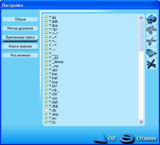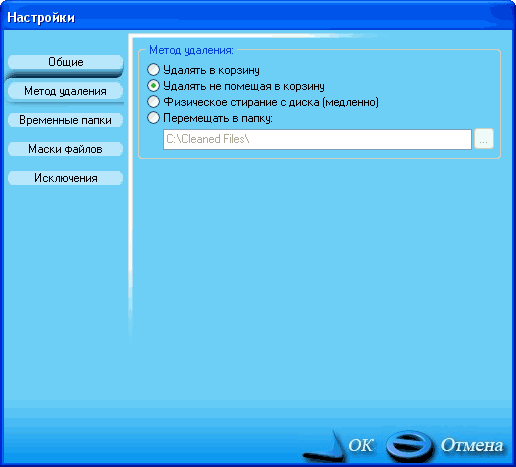 Как видно из скриншотов, там по умолчанию указано большое количество известных расширений и папок, и вам остается только снять отметку с тех расширений/папок, которые вы не хотите отмечать для удаления. После этого нужно выбрать метод удаления: