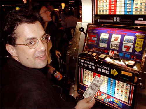 Вообще, если внимательно рассмотреть данную фотографию, то можно сразу сажать весь калужский игровой бизнес. Ведь отчетливо видно, что этот азартный игрок собирается расплачиваться стобаксовой купюрой, которая, по идее, не должна иметь хождение на всей территории Российской Федерации, а Калуга пока еще не объявлена вольным городом. Кроме того, игровой автомат на снимке явно принадлежит к системе "Мегабакс", которая в России еще не введена, а действует только на территории Соединенных Штатов. Да и рожа человека у автомата уж больно какая-то довольная - явно он кайфует не в калужском казино, а как минимум в Лас-Вегасе. И точно! Если как следует покопаться в Интернете, то можно найти оригинал фотографии, которую безвестный верстальщик "Калужской недели", долго не мудрствуя, просто спер из глубин моего сайта и влепил в качестве иллюстрации к статье о калужском игорном бизнесе. Вот так я из Лас-Вегаса резко переместился в Калугу, став там модельным лицом организованного азарта. Дурдом на колесах, вот что я вам скажу...