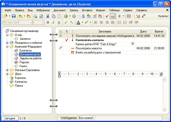 Если вас не устраивает MS Outlook в качестве домашнего электронного органайзера, а он вполне может не устраивать из-за своей монстрообразности, то вот одна из альтернатив - WinOrganizer от The Golden Selection Labs. Мне в свое время для одного из знакомых пришлось искать какой-то небольшой, но эффективный органайзер, я перебрал несколько вариантов и этот счел одним из лучших.