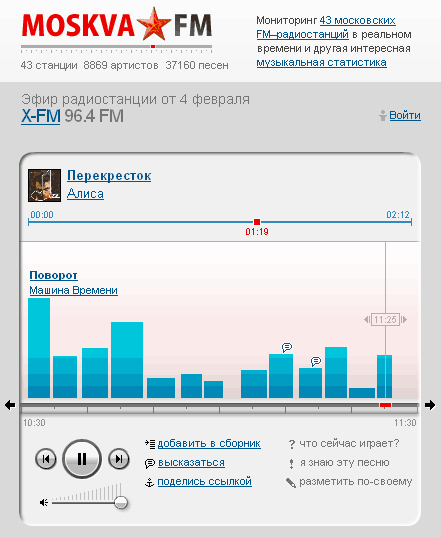 Еще там есть волшебная кнопочка "Сейчас в эфире", по которой можно увидеть список композиций и исполнителей, которые в настоящий момент звучат на этих 43 радиостанциях. Также хит-парад за прошлую неделю, ваш собственный хит-парад и возможность зарегистрированным пользователям оставлять свои комментарии к композициям.