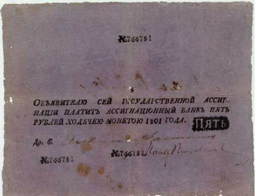 Танцевать можно начинать от печки - то есть от континента. Далее выбираете страну, после чего получаете по ней табличку со списком отсканированных изображений денежных банкнот за довольно широкий исторический период. Посмотрите, например, какая внушительная табличка представлена по России. Я такого еще не встречал. Вот, например, 5 рублей 1801 года: