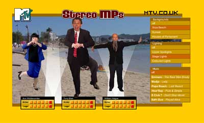 Очередная забавная флешка - танцующие английские политики во главе с ушастым Блэром. Вы можете регулировать движения рук и ног каждого из танцующей троицы по пяти позициям. Кроме того, можно задавать площадку для выступления, освещение и музыкальное сопровождение. Короче говоря, почувствуйте себя кукловодом по полной программе.