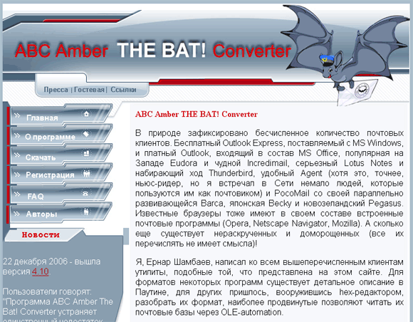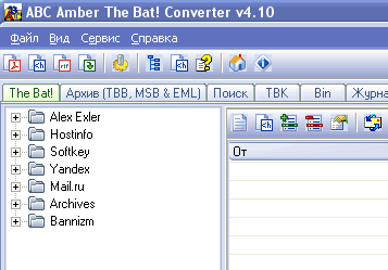 Лично меня как старого пользователя The Bat! прежде всего интересовала возможность экспорта батовских баз. Для этого Ернаром создана версия под названием ABC Amber THE BAT! Converter, скачать которую можно здесь (демоверсия).