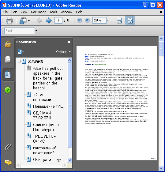 Возьмем, например, PDF. Выбираем письма, нажимаем кнопку "Экспорт в PDF". Кстати, сам процесс экспорта идет с очень большой скоростью. Преобразованные письма внутри одного PDF раскладываются по страничкам и снабжаются закладками - читать такой документ потом очень удобно: