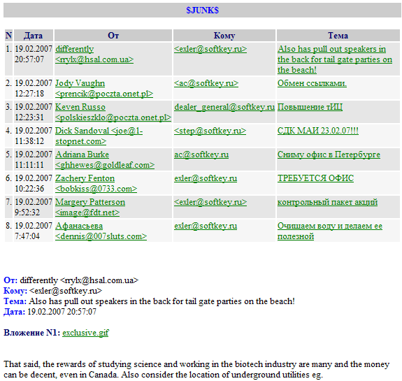 Экспорт в HTML также делается весьма грамотно: в начале документа дается табличка со списком писем, а гиперссылки из таблички ведут на тексты писем, расположенные ниже: