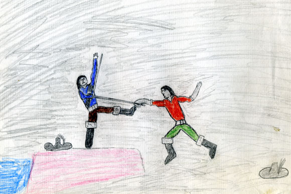 О, нашел один свой глубоко детский рисуночек. (Действительно мой, не шучу - родители заботливо сохранили.) Это капитан Блад закалывает какого-то козла на берегу.