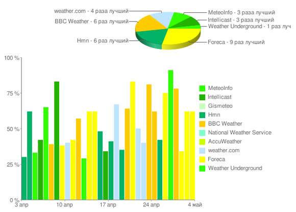 Например, по прошедшим пяти суткам сервис Foreca показал 50%-ную эффективность, а Gismeteo - 24%-ную эффективность.