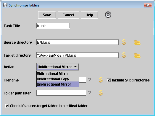 Синхронизация папок (то, что мне и было нужно) настраивается легко и просто. При этом программа умеет делать не просто обычное тупое копирование, а создавать двунаправленное зеркало (чтобы вы могли изменять данные в архиве, а это отражалось бы в основной папке).