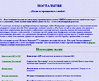 Проект "Ностальгия". Заглядываем и ностальгируем по полной программе! Песни прошлых лет, любимые мелодии детства, мелодии телевидения, песни Великой Отечественной, фотогалерея звезд советской эстрады - и так далее! Плюс - ссылки на сайты, посвященные ретромузыке, статьи по оцифровке звука (как создать MP3) и форум любителей ретромузыки.