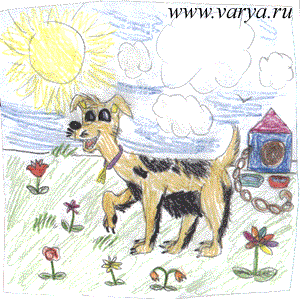 Главное - настроение бобика передано здорово! Солнце, собачья будка, цветочки - это все фигня, я и сам так в свои 38 лет могу. А вот такую радостную рожицу нарисовать - не получится.