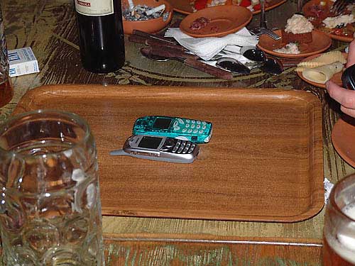 Выглядит забава очень просто. Берется от двух до четырех участников. Каждый из них достает свою мобилу соответствующей крутизны. Мобилы кладутся на центр стола (или на поднос), после чего окружающие по сигналу судьи начинают звонить на мобилы участников. У тех, разумеется, должен быть включен вибросигнал. Так вот, после того, как на телефоны поступают звонки, мобилы начинают вибрировать и перемещаются по столу. Выигрывает тот, чья мобила первой доползла до края стола (или до края подноса) и, например, свалилась на пол и не разбилась. Ну или, если без экстрима, просто доползла до края стола или подноса. Вот как это выглядело:
