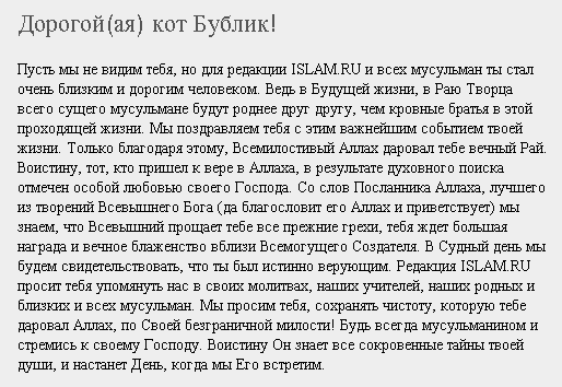 Я был потрясен. Так просто, но вместе с тем - эффективно! Сам я, правда, ислам принимать не рискнул, но тут кот Бублик стал царапаться и требовать ислама. Хотя бы полпорции. Я разрешил, в результате чего кот Бублик был удостоен трогательного послания: