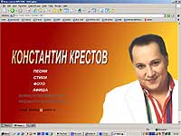 Сайт Константина сделан вполне пристойно. Правда, расцветкой он страшно напоминает брошюры фирмы "1С", но это только плюс, а не минус. На этой странице вы сможете ознакомиться с творчеством Константина - песнями, стихами, фотографиями и гостевой книгой. В фотоальбоме - куча изображений Константина Крестова с различными знаменитостями, с которыми он сфотографировался во время концерта на Васильевском спуске. Я не знаю, выступал ли там Константин, или же он просто тусовался, но запечатлеться он успел со всеми монстрами отечественной попсы. Что интересно, даже там Константин себя скромно именует "Я". Например, "Алена Свиридова и Я", "Анжелика Варум и Я"...