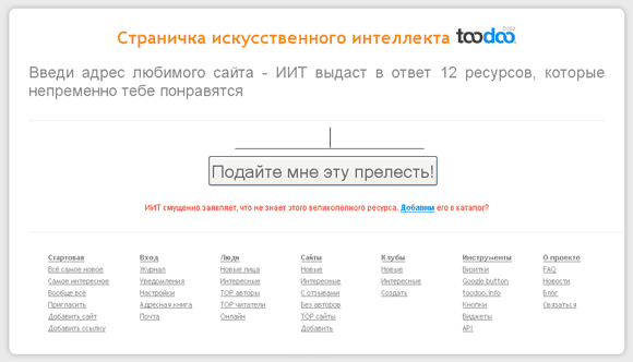 На ToDoo завелась страничка искусственного интеллекта. Там можно ввести нравящийся вам сайт, и вам в ответ выдадут двенадцать аналогичных, по мнению сервиса, ресурсов, которые вам также должны понравиться. Причем нередко страничка выдает не двенадцать ресурсов, а значительно больше. Хотя и бывают случаи, что сервис какую-то страницу в упор не знает, и в этом честно, хотя и несколько смущенно, признается.