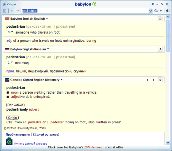 Я вполне отдаю должное замечательному словарю Lingvo, однако сам уже давно пользуюсь знаменитой во всем мире оболочкой Babylon. "Вавилон" и как оболочка весьма удобен (в общем, это лучшее, что я видел из всех интерактивных словарей), и любых словарей (в том числе толковых и энциклопедических) под него - вагон и маленький паровозик. В базовый комплект кроме толкового английского входит и выбранный вами иностранный язык (например, русско-английский и англо-русский), а также в любой момент можете докупать какие угодно словари (по каждому из них предоставляется 15- или 30-дневный тестовый период): Merriam-Webster, Oxford и так далее.