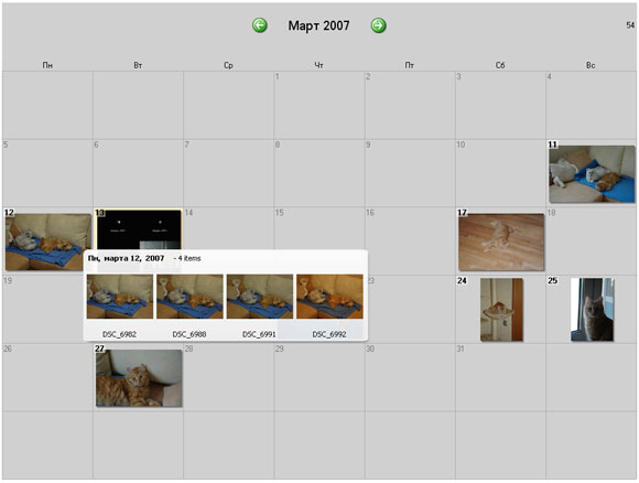 Вот это весьма интересная опция. Вы вызываете календарь, на котором крайне наглядно видно, какие фото когда сняты. Если в какой-то день было несколько фото, показывается превью первой и количество. При подведении курсора мышки показывается полный набор фото этого дня. На мой взгляд, очень удобно и полезно.