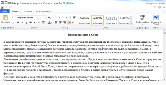 Однако, когда попробовал, как эта система работает в SkyDrive (онлайновое хранение файлов и возможность совместной работы над ними), оказалось, что выглядит это все очень интересно. Вот там действительно вы можете не только просматривать документы MS Office без установки пакета MS Office, но и редактировать их прямо в браузере. Возможности редактора, конечно, заметно отличаются от соответствующих приложений MS Office, однако всякие простые действия производятся вполне нормально.