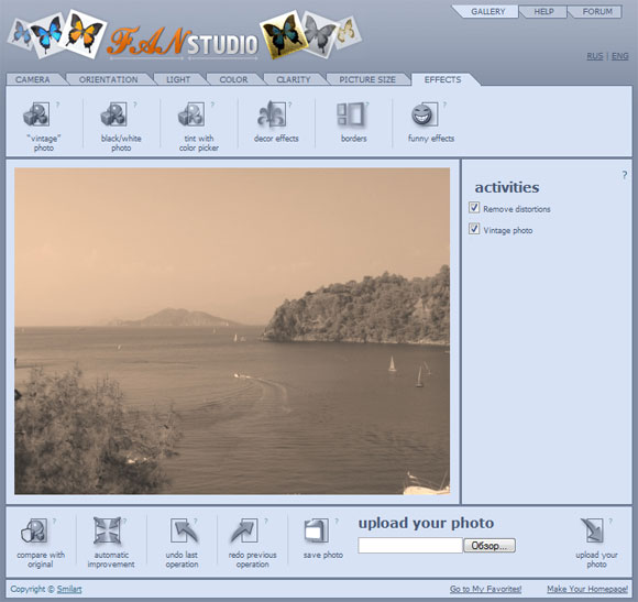 Очередной онлайновый редактор - FanStudio. Симпатичный и функциональный. Загружаете фотографию, после чего вам доступные следующие виды действий: