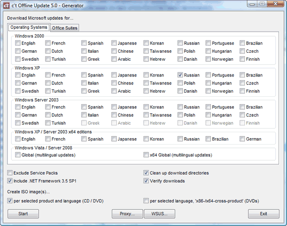 Программа работает очень просто. Задаете версию операционной системы или Office, выбираете нужный язык, после чего щелкаете по кнопке Start. Далее программа скачивает все нужные обновления и создает из них образ DVD- или CD-диска, который вы потом записываете на соответствующий диск, например, с помощью программы Nero Burning ROM или какой-то другой.