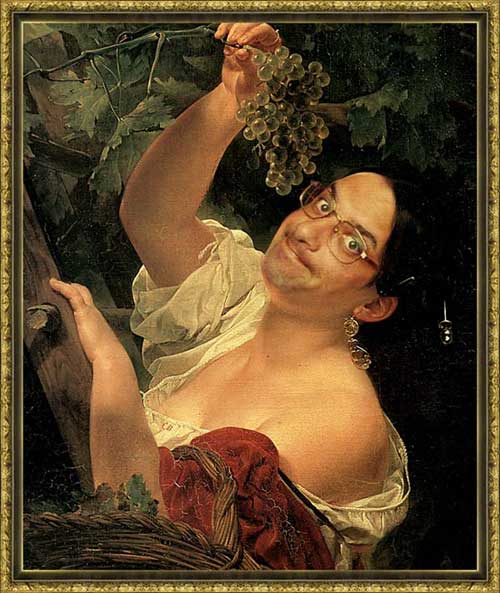Кстати, о картинках. Дизайнер Image (о чьей галерее работ я рассказывал в прошлом обзоре) создала новый немеркнущий шедевр. Картину вы наверняка узнаете. Это "Итальянский полдень" Брюллова. Правда, итальянка несколько видоизменилась, и над пышными грудями теперь светится хитрая морда сами понимаете кого, но тем не менее от всей картины по прежнему так и веет ласковой негой солнечного итальянского дня и запахом винограда, находящегося в преддверии коньяковского. Любуемся: