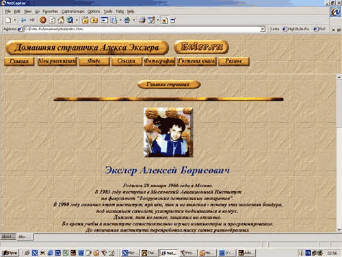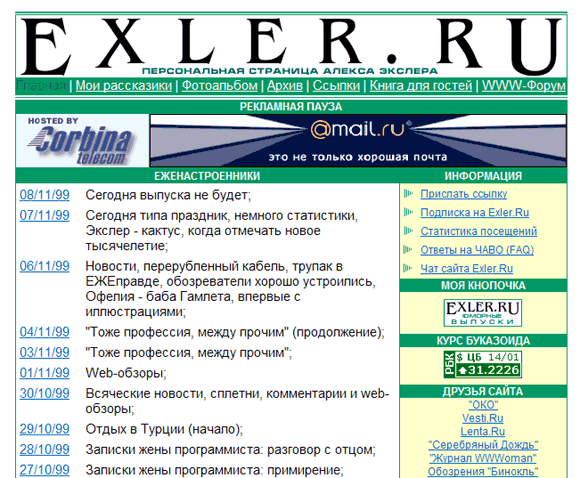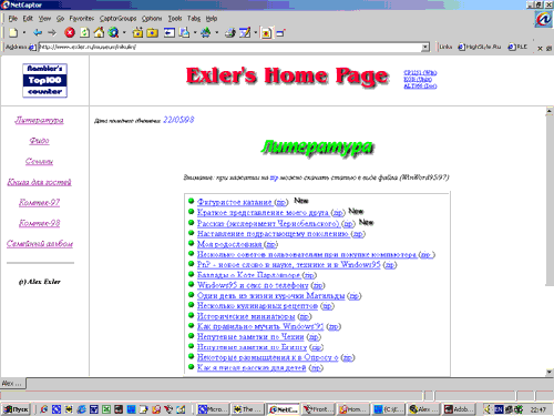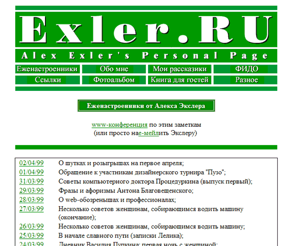 Летом 1998 года Михаил Никулин (он сейчас живет и работает в Штатах) и Юрий Сафронов (все фидошники Сафронова отлично знают) зарегистрировали для меня домен exler.ru. Это вдохновило на подвиги, в результате чего я взял в руки FrontPage и сотворил невероятно стильный (как тогда казалось) дизайн в стиле "Еврейские писатели в русской бане".