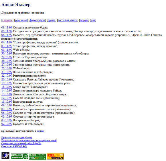 Собственно, как оно все начиналось, легко увидеть здесь. Вот самый первый выпуск. Далее пошли так называемые веб-обзоры. (Жанр, из которого родились современные блоги - веб-логи.) 26 февраля 1999 года появилась концептуально новая сущность - литературный сериал "Дневник Васи Пупкина" (вот его первый выпуск). В дальнейшем этих сериалов было несколько - "Записки кота Шашлыка", "Записки невесты программиста" и так далее. "Записки невесты программиста" вызвали интерес у Димы Вернера, создателя Anekdot.ru, и по договоренности с ним новые выпуски раз в неделю публиковались на сайте Anekdot.ru.