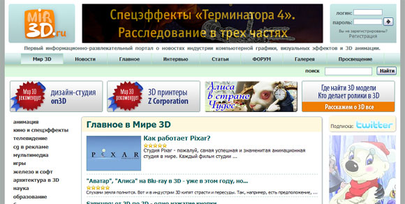 Информационно-развлекательный сайт "Мир 3D". Выполнен в виде онлайнового журнала, рассказывающего о мире трехмерных технологий. Анимация, кино и спецэффекты, телевидение, трехмерные эффекты в рекламе, мультимедиа, игры, железо и софт, архитектура в 3D, ну и так далее. Статьи очень неплохо написаны и хорошо иллюстрированы - почитать было очень интересно.