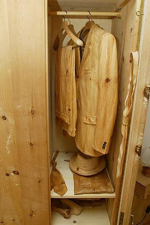 Вот, например, сваял Ливио шкаф для одежды! Ничего удивительного, правда? Однако показался этот шкафчик мастеру пустоватым, после чего он засунул туда костюм, брюки, шляпу, рубашку, галстук и туфли - сделанные из дерева! Чего шкафу пустовать, ведь правильно? И из банального шкафа получилось произведение столярного искусства.