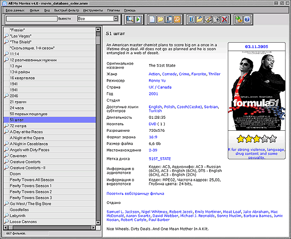 Обновилась программа AllMyMovies, которую я использую для ведения своей коллекции фильмов (вот онлайновая база моей коллекции нероссийских фильмов, российские у меня хранятся отдельно). Обновилась до мажорной версии - 4.0. Нововведения, кстати, значительны. Во-первых, изменилась структура базы данных, в результате чего программа стала загружаться на порядок быстрее - раньше на базе из более чем 600 фильмов на быстром компьютере программа очень заметно тормозила при запуске.