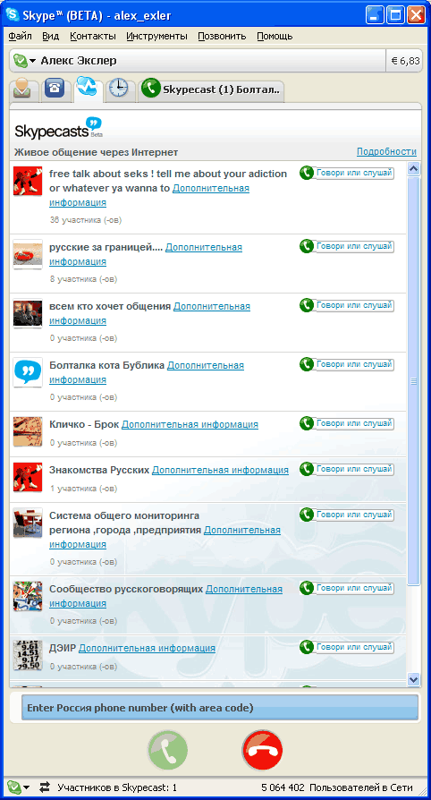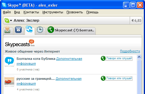 Что там в третьей версии? Есть весьма серьезные, интересные и полезные нововведения. Прежде всего - это скайпкасты, голосовые чаты. Список активных на данный момент скайпкастов выдается в новой верхней закладке. Там хорошо видно, что это за чаты, а главное - сколько в них на данный момент находится народу.