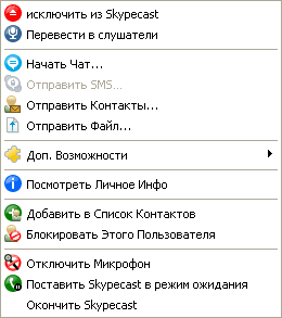 Вы можете участвовать в беседе, а можете просто слушать, нажав соответствующую кнопку. Организатор скайпкаста в любой момент может лишить всех (или конкретных) участников слова, переведя их в режим "просто слушать". По выходе из чата вам могут предложить добавить определенных его участников в свой контакт-лист.