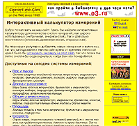 Крайне полезная штука - сайт Convert-Me. Ну просто конвертирует все что угодно во все что угодно, причем сначала вам предлагается выбрать, что именно вы собираетесь конвертировать - вес и массу, длину и расстояние, объем и вместимость, площадь, скорость и так далее, - а далее предлагается целый набор различных систем измерений, включая весьма экзотические, вроде древнеримских, древнегреческих и библейских (это может весьма пригодиться историкам и ученым).