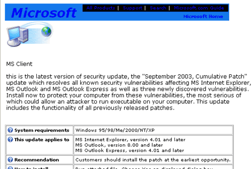 Но есть еще одна проблема. Разумеется, не такая огромная и разрывающая сердце, но тоже неприятная... Наши доблестные вирусописаки осчастливили наш доблестный Интернет очередным произведением своих ублюдских мозгов, после чего разослали троян в письмах якобы от компании Microsoft, где пользователям якобы предлагается установить на компьютер некий патч, приложенный к письму, который, дескать, закроет некую дырку в безопасности различных майкрософтовских приложений. Выглядело письмо примерно так: