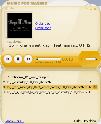 После этого просто открываете подготовленные треки в плеере Music For Masses - они будут воспроизводиться во вполне приличном качестве (учитывая бесплатность) - 128 kbps.