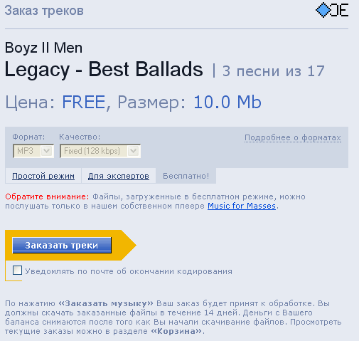 На сайте Allofmp3, который является главным препятствием вступления России в ВТО, предлагают довольно забавную штуку - плеер, позволяющий бесплатно прослушивать любые композиции с любых альбомов сайта, а коллекция там гигантская. Схема действия проста. Скачиваете и устанавливаете плеер. Затем заходите на сайт, логинитесь (регистрация бесплатна), выбираете любые треки из любых альбомов (ну или альбомы целиком), нажимаете ссылку "Добавить в корзину". После этого заходите в корзину, нажимаете ссылку "Бесплатно", после чего - кнопку "Заказать треки".