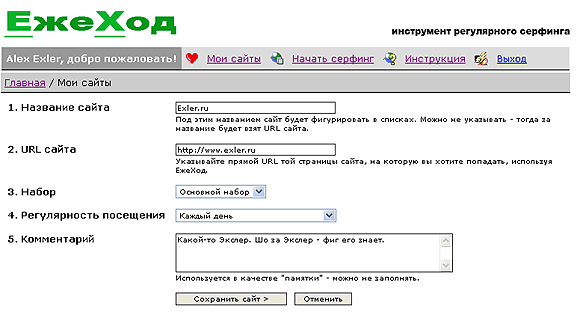 Для фанатов-серферов, которые каждый день с неутомимостью лесничего обходят различные сайты, создан простенький, но вполне эффективный сервис - "ЕжеХод". Действует он следующим образом. Регистрируетесь (разумеется, бесплатно), а затем в своих настройках указываете сайты, которые вы посещаете с определенной периодичностью.