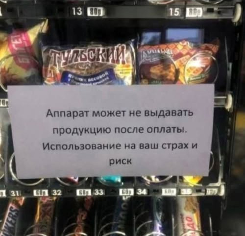 Какое трогательное предупреждение, умиляется Анита. Но лучше было бы написать: "Да, аппарат может не выдать товар после оплаты. Но ты что - не мужик, что ли?"