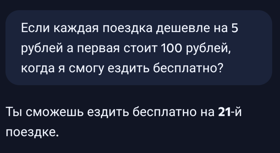 Если каждая поездка будет дешевле на пять рублей, замечает Кузя, то в какой-то момент ее стоимость станет равной нулю, а дальше уже трамвай должен будет платить пассажирам за проезд. — что за бред, эта оферта вовсе не обещает поездки дешевле ПРЕДЫДУЩЕЙ, а просто дешевле. Дешевле чего — не уточнено, может, дешевле космического туризма. На пятерку.