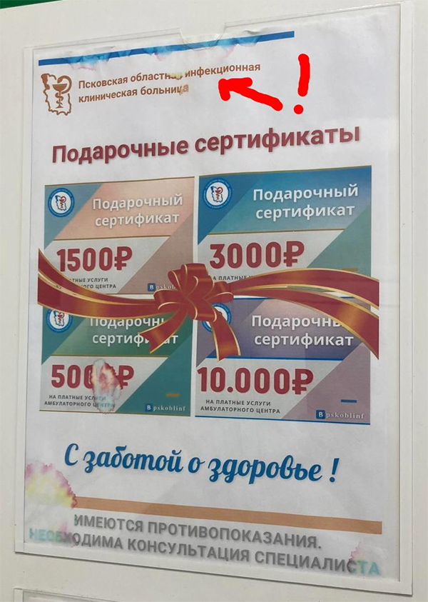Интересно, в этом заведении подарочные сертификаты на ампутацию мозгов выдают или нет, задумывается Александр. Потому что в Псковской областной инфекционной клинической больнице - выдают!