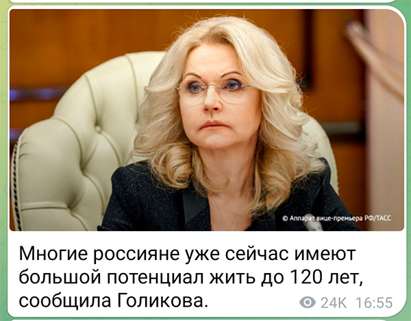 На вопрос корреспондента, почему же сейчас россияне часто помирают уже в 40-50 лет, Голикова ответила: "А потому что не реализуют свой потенциал".