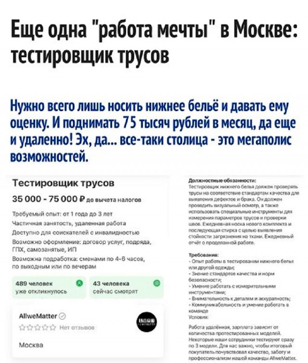 Тестировщику трусов, кстати, нужен опят работы от 1 до 3 лет. Это типа "уже три года ношу трусы"? 😄