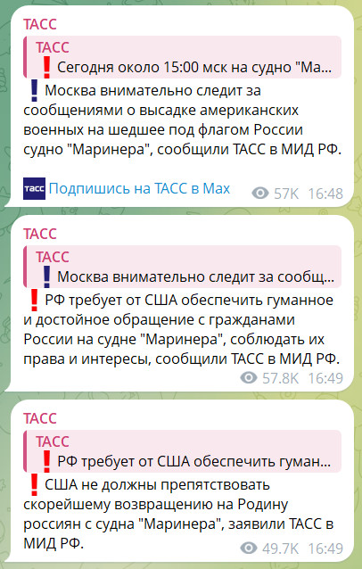 Вполне возможно, кстати, что через некоторое время Трамп снова потеплеет к "другу Вове" и снова будет ему предлагать мутить что-нибудь вместе против подлой Европы, но пока мы имеем то, что имеем. И в этом плане история показательного захвата двух мутных танкеров с поддельными российскими документами (а их там еще, насколько я понял, 14 штук таких же плавает) - она очень обнадеживающая. Похоже, что, по крайней мере на данный момент, Трамп в отношении РФ перестал, как говорит Вова Путин, сопли жевать.