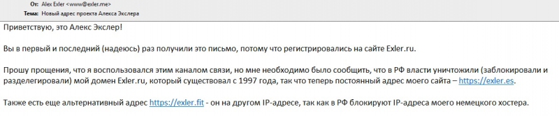 После убивания властями РФ моего домена exler.ru посещаемость сайта упала больше чем на треть. У меня есть подозрение, что многие пользователи просто не знают, по какому адресу теперь можно найти мой сайт (понятно, что поиском это можно найти, но не все так напрягаются), поэтому мы сделали разовую рассылку (ну, точнее, потихоньку делаем эту рассылку, чтобы не забивать почтовые каналы) писем по адресам читателей, зарегистрированных на сайте, в которых указали новый адрес и альтернативный адрес, расположенный на другом IP (пул адресов моего немецкого провайдера в РФ блокируют).